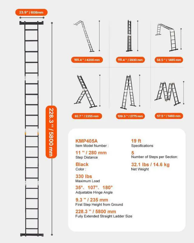 Specifications : 19 ft / 5.8m,Max. Load in Platform Position: 330 lbs / 149.7 kg,Number of Sections: 4 pcs,Max. Load in A-Frame Position: 330 lbs / 149.7 kg,Step Distance: 11 '' / 280 mm,Item Model Number: KMP405A,Item Size(Folded without balance bar): 13.6''x10.2''x60.2'' / 345x260x1530 mm,Fully Extended Straight Ladder Size: 228.3 '' / 5800 mm,Item Size(A-frame with balance bar): 76''x27.9''x109.3'' / 1930x708x2775 mm,Max. Load in Straight Position: 330 lbs / 149.7 kg,Net Weight: 32.2 lbs / 14.6 kg