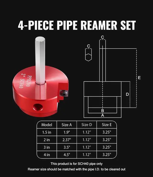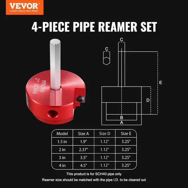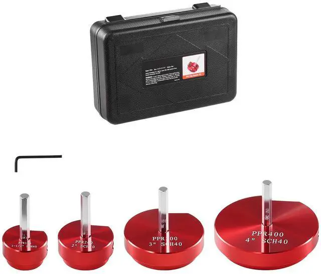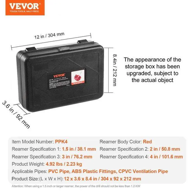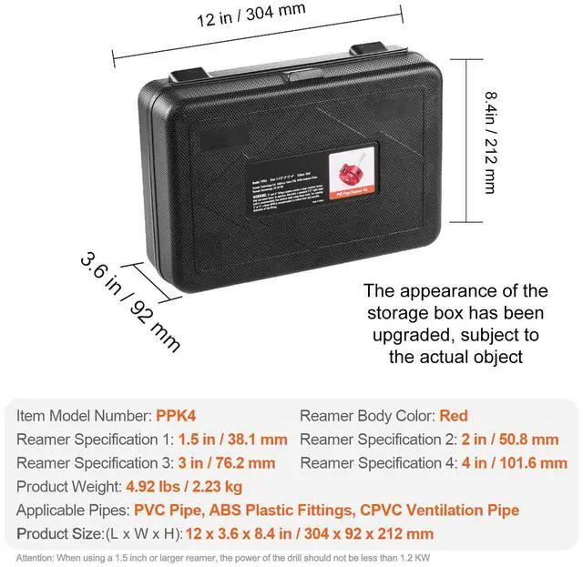 Blade Material: Tungsten Steel GU20+,Reamer Body Color: Red,Applicable Pipes: PVC Pipes, ABS Plastic Fittings, CPVC Ventilation Pipes,Item Model Number: PPK4,Reamer Body Material: Aluminum Alloy 6061,Reamer Specification 1: 1.5 in/38.1 mm,Reamer Specification 2: 2 in/50.8 mm,Reamer Specification 3: 3 in/76.2 mm,Handle Material: Carbon Steel 45#,Reamer Specification 4: 4 in/101.6 mm,Product Size: 12 x 3.6 x 8.4 in/304 x 92 x 212 mm