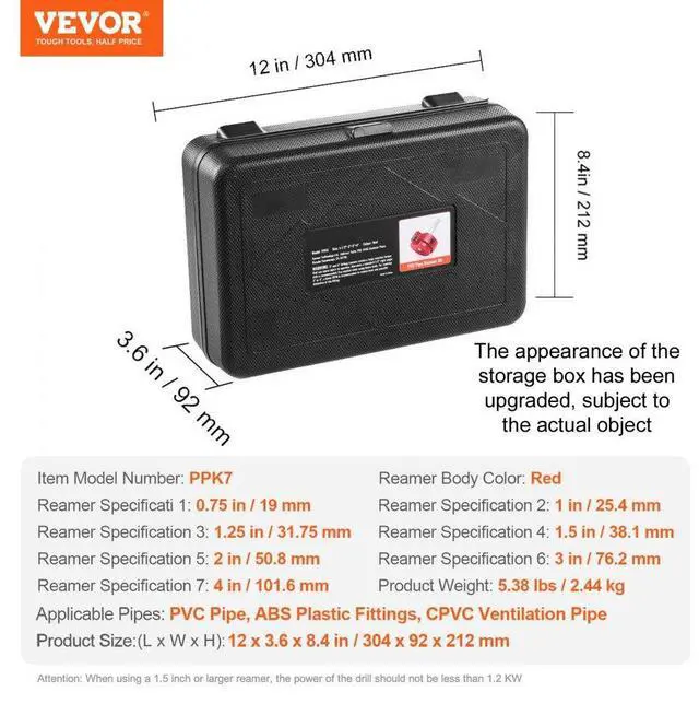 Blade Material: Tungsten Steel GU20+,Reamer Specification 5: 2 in/50.8 mm,Reamer Specification 6: 3 in/76.2 mm,Reamer Specification 7: 4 in/101.6 mm,Reamer Body Material: Aluminum Alloy 6061,Reamer Specification 1: 0.75 in/19 mm,Reamer Specification 2: 1 in/25.4 mm,Reamer Specification 3: 1.25 in/31.75 mm,Reamer Specification 4: 1.5 in/38.1 mm,Product Size: 12 x 3.6 x 8.4 in/304 x 92 x 212 mm,Reamer Body Color: Red,Applicable Pipes: PVC Pipes, ABS Plastic Fittings, CPVC Ventilation Pipes,Item Model Number: PPK7,Handle Material: Carbon Steel 45#