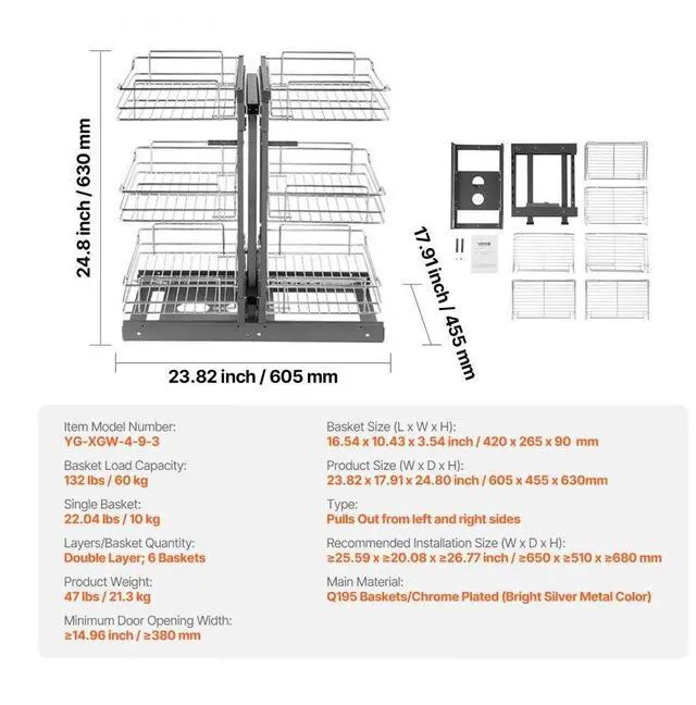 Minimum Door Opening Width: 14.96 inch / 380 mm,Item Model Number: YG-XGW-4-9-3,Product Weight: 47 lbs / 21.3 kg,Basket Size: 16.54 x 10.43 x 3.54 inch / 420 x 265 x 90 mm,Recommended Installation Size: 25.59 x 20.08 x 26.77 inch / 650 x 510 x 650 mm,Product Size : 23.82 x 17.91 x 24.80 inch / 605 x 455 x 630 mm,Basket Load Capacity: 132 lbs / 60 kg,Main Material: Q195 Baskets/Chrome Plated