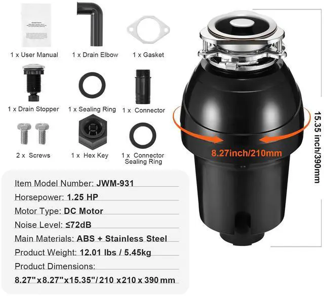 Noise Level: 72 dB,Main Materials: ABS + Stainless Steel,Horsepower: 1.25 HP,Motor Type: DC Motor,Item Model Number: JWM-931,Product Weight: 12.01 lbs / 5.45 kg,Product Dimensions: 8.27" x 8.27" x 15.35" / 210 x 210 x 390 mm