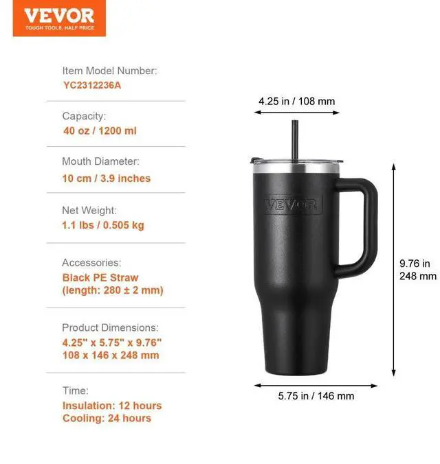 Accessories: Black PE Straw (length: 280 ± 2 mm),Capacity: 40 oz / 1200 ml,Color: Black Body, Transparent AS Lid,Item Model Number: YC2312236A,Mouth Diameter: 10 cm / 3.9 inches,Opening Method: Press-Type Lid,Time: Insulation: 12 hours / Cooling: 24 hours,Product Dimensions: 4.25" x 5.75" x 9.76" / 108 x 146 x 248 mm,Net Weight: 1.1 lbs / 0.505 kg,Certification: FDA,Main Material: SUS304 Stainless Steel + AS + PP + Silicone