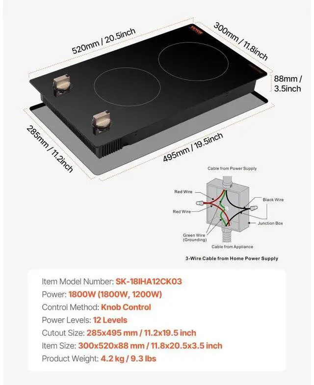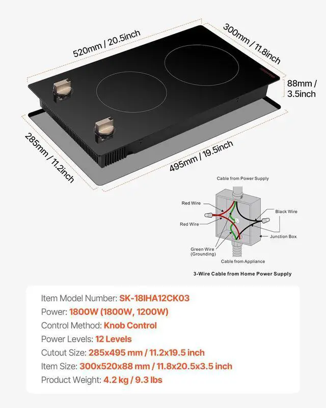 Cutout Size: 285x495 mm / 11.2x19.5 inch,Item Size: 300x520x88 mm / 11.8x20.5x3.5 inch,Control Method: Knob Control,Item Model Number: SK-18IHA12CK03,Product Weight: 4.2 kg / 9.3 lbs,Power: 1800W,Power Levels: 12 Levels