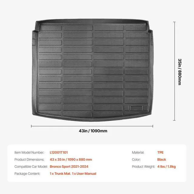 Compatible Car Model: Bronco Sport 2021-2024,Color: Black,Item Model Number: L12001T101,Product Weight: 4 lbs / 1.8 kg,Material: TPE,Product Dimensions: 43 x 35 in / 1090 x 880 mm