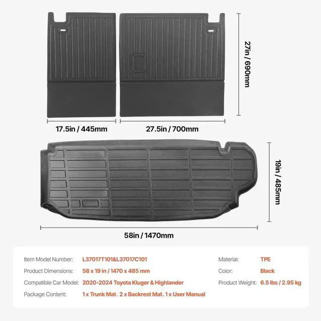 Compatible Car Model: Kluger & Highlander 2020-2024,Left Backrest Mat Dimensions: 27 x 17.5 in / 690 x 445 mm,Color: Black,Item Model Number: L37017T101&L37017C101,Product Weight: 6.5 lbs / 2.95 kg,Right Backrest Mat Dimensions: 27 x 27.5 in / 690 x 700 mm,Material: TPE,Cargo Mat Dimensions: 58 x 19 in / 1470 x 485 mm