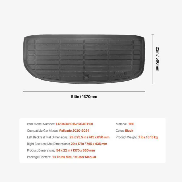 Compatible Car Model: Palisade 2020-2024,Left Backrest Mat Dimensions: 29 x 25.5 in / 745 x 650 mm,Color: Black,Item Model Number: L17040C101&L17040T101,Product Weight: 7 lbs / 3.15 kg,Right Backrest Mat Dimensions: 29 x 17 in / 745 x 435 mm,Material: TPE,Cargo Mat Dimensions: 54 x 22 in / 1370 x 560 mm