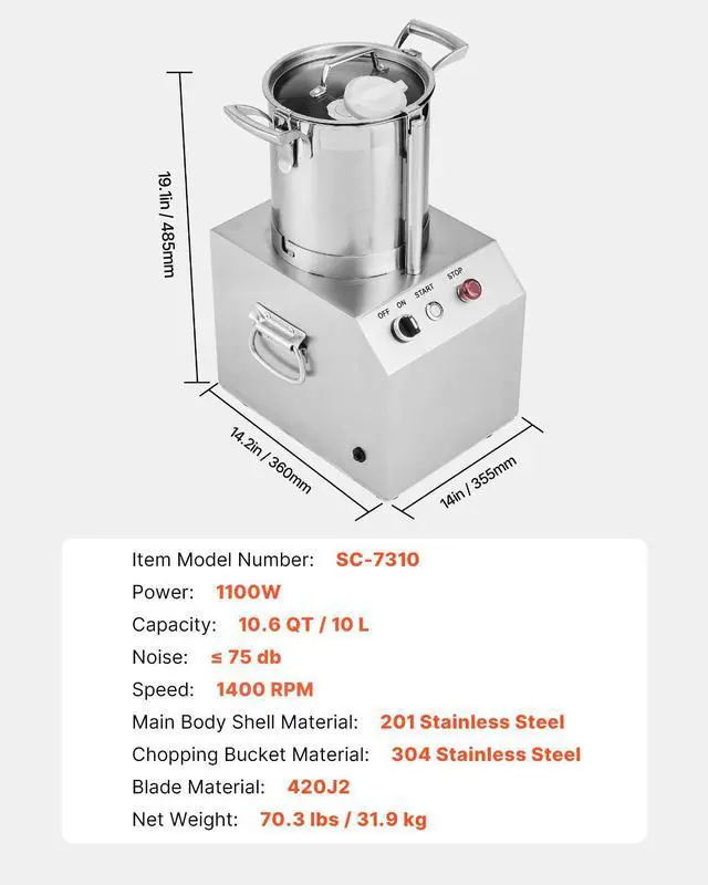 Blade Material: 420J2,Speed: 1400 RPM,Capacity: 10.6 QT / 10 L,Noise: 75 db,Chopping Bucket Material: 304 Stainless Steel,Item Model Number: SC-7310,Main Body Shell Material: 201 Stainless Steel,Net Weight: 68.4 lbs / 31.0 kg,Power: 1100W,Product Size: 14.2 x 14 x 22.2 inches / 360 x 355 x 565 mm