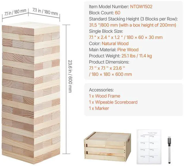 Block Count: 60,Standard Stacking Height (3 Blocks per Row): 31.5" / 800 mm(with a box height of 200mm),Single Block Size: 7.1" x 2.4" x 1.2" / 180 x 60 x 30 mm,Item Model Number: NTGW1502,Product Weight: 25.1 lbs / 11.4 kg,Product Dimensions: 16.1" x 13.8" x 7.7" / 410 x 350 x 195 mm