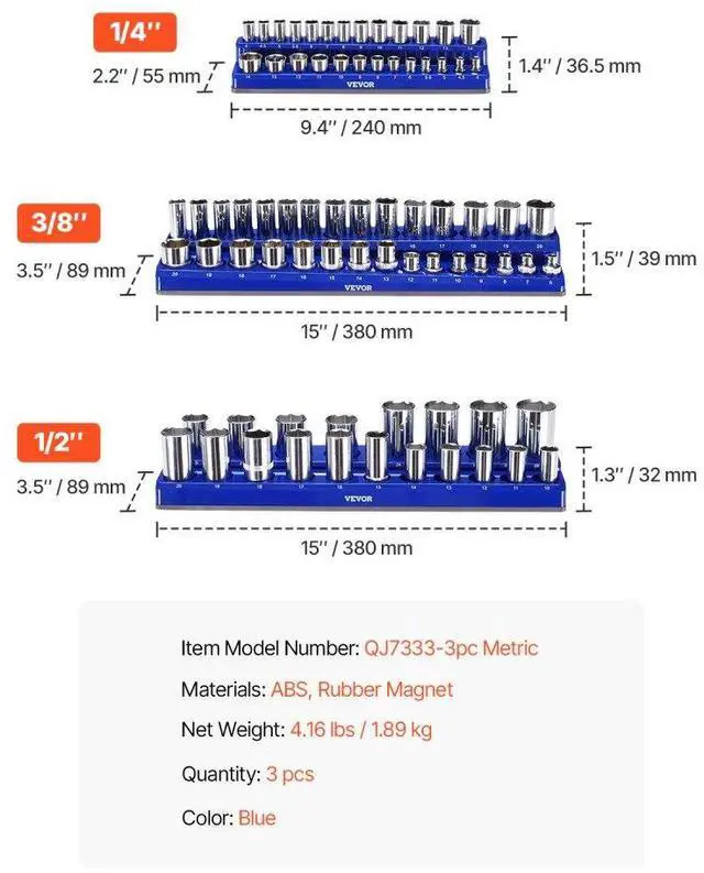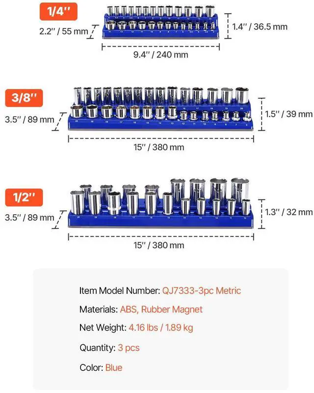 14.96'' × 3.50'' × 1.53'' / 380 x 89 x 39 mm (3/8 Sizes):,9.44'' × 2.16'' × 1.43'' / 240 x 55 x 36.5 mm (1/4 Sizes):,Materials: ABS, Rubber Magnet,Color: Blue,Item Model Number: QJ7333-3pc Metric,Quantity: 3 pcs set in Metric,14.96'' × 3.50'' × 1.25'' / 380 x 89 x 32 mm (1/2 Sizes):,Product Dimensions:,Net Weight: 4.16 lbs / 1.89 kg