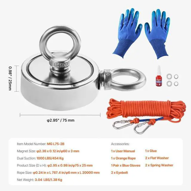Dual Suction: 1000 LBS/454Kg,Rope Size: 0.24 in x L 787.40 in/6 mm x L20000 mm,Product Size (D x H): 2.95x0.98 in/75x25 mm,Item Model Number: MG L75-2B,Net Weight: 3.04 LBS/1.38 Kg,Magnet Size: 2.36x0.12 in/60x3 mm