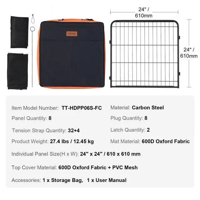 Latch Quantity: 2,Panel Quantity: 8,Top Cover Material: 600D Oxford Fabric + PVC Mesh,Item Model Number: TT-HDPP06S-FC,Product Weight: 26.5 lbs / 12 kg,Material: Carbon Steel,Plug Quantity: 8,Tension Strap Quantity: 32+4,Individual Panel Size (H x W): 24" x 24" / 610 x 610 mm,Mat Material: 600D Oxford Fabric
