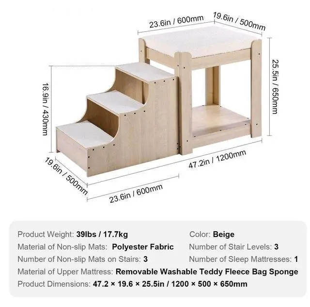 Number of Sleep Mattresses:1,Number of Stair Levels:3,Material of Non-slip Mats: Polyester Fabric,Color:Beige,Item Model Number: 099-1A,Product Weight:39lbs / 17.7kg,Specification: Small,Product Dimensions (L x W x H):47.2x19.6x25.5 in / 1200x500x650 mm,Number of Non-slip Mats on Stairs:3,Material of Upper Mattress:Removable Washable Teddy Fleece Bag Sponge