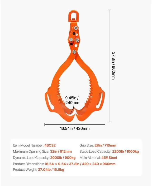 Grip Size: 28 in (710 mm),Static Load Capacity: 2200 lbs (1000 kg),Item Model Number: 4SC32,Product Weight: 16.8 kg / 37.04 lbs,Dynamic Load Capacity: 2000 lbs (900 kg),Maximum Opening Size: 32 in (812 mm),Product Dimensions: 420 x 240 x 960 mm / 16.54 x 9.45 x 37.80 in,Main Material: 45# Steel