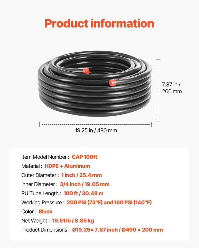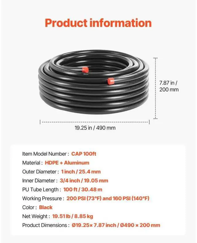 Outer Diameter: 1 inch / 25.4 mm,PU Tube Length: 100 ft / 30.48 m,Working Pressure: 200 PSI (73°F) and 160 PSI (140°F),Inner Diameter: 3/4 inch / 19.05 mm,Color: Black,Item Model Number: CAP 100ft,Material: HDPE + Aluminum,Product Dimensions: Ø19.25 x 7.87 in / Ø490 x 200 mm,Net Weight: 19.51 lb / 8.85 kg