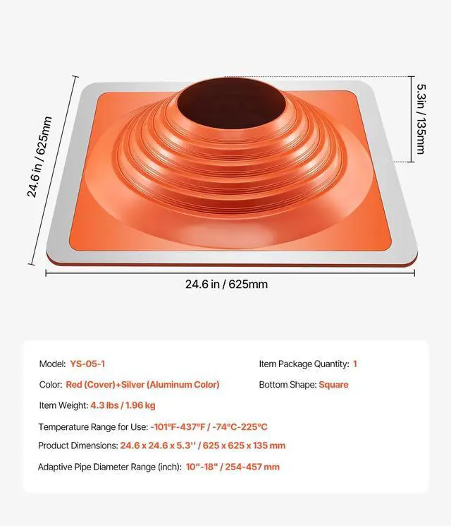 Item Package Quantity: 1,Temperature Range for Use: -101-437 / -74-225,Color: Red (Cover)+Silver (Aluminum Color),Item Model Number: YS-05-1,Bottom Shape: Square,Product Dimensions: 24.6 x 24.6 x 5.3'' / 625 x 625 x 135 mm,Adaptive Pipe Diameter Range (inch): 10"-18" / 254-457 mm,Item Weight: 4.3 lbs / 1.96 kg