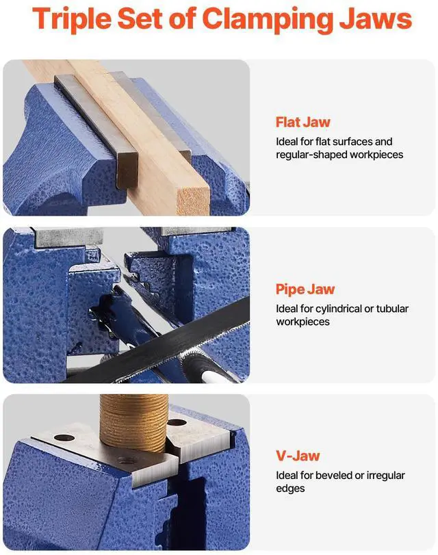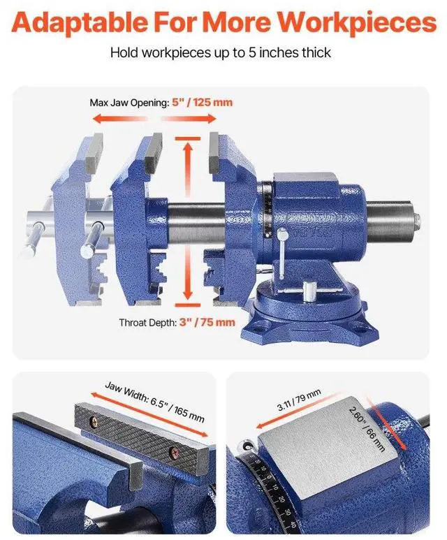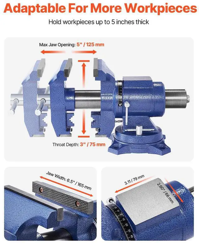 Jaw Width: 6.5" / 165 mm,Max Jaw Opening: 5" / 125 mm,Throat Depth: 3" / 75 mm,Pipe Jaw Capacity: 0.59-2.56" / 15-65 mm,Item Model Number: 9467,Swivel Base and Head: 360 Degree,Anvil Size: 3.11 x 2.60" / 79 x 66 mm,Material: Ductile Cast Iron QT450, Carbon Steel Q235, Carbon Steel 45#,Product Dimensions (L x W x H): 17.13 x 6.89 x 9.84" / 435 x 175 x 250 mm,Net Weight: 39.01 lbs / 17.65 kg