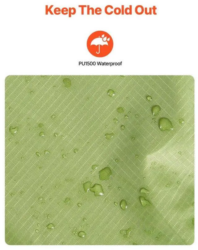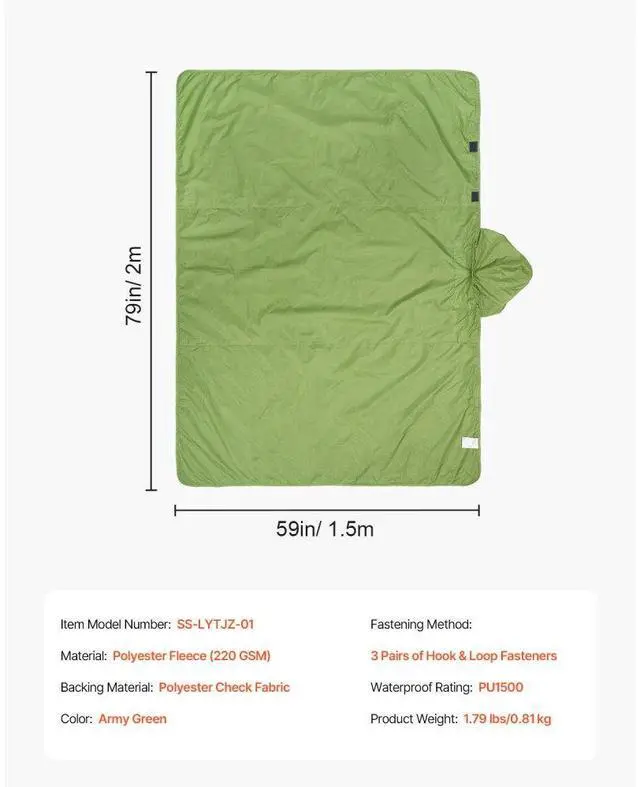 Waterproof Rating: PU1500,Color: Army Green,Fastening Method: 3 Pairs of Hook & Loop Fasteners,Item Model Number: SS-LYTJZ-01,Product Weight: 1.79 lbs/0.81 kg,Backing Material: Polyester Check Fabric,Main Material: Polyester Fleece (220 GSM),Product Size: 79" x 59"/2 m x 1.5 m