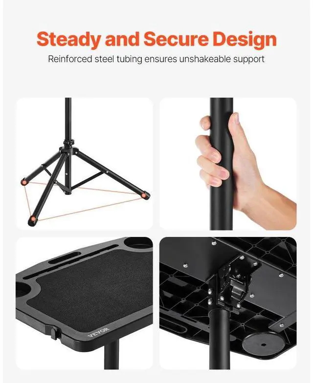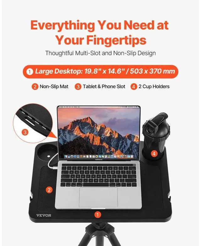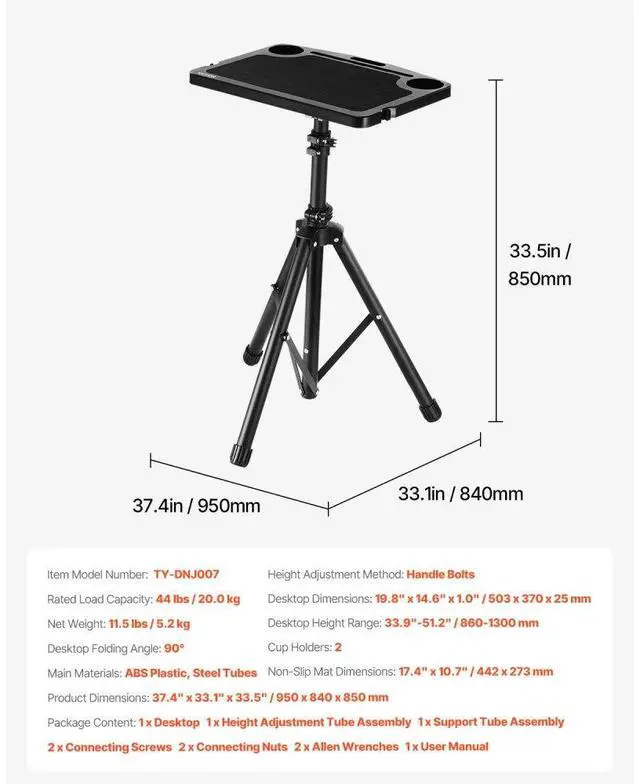 Non-Slip Mat Dimensions: 17.4" x 10.7" / 442 x 273 mm,Desktop Dimensions: 19.8" x 14.6" x 1.0" / 503 x 370 x 25 mm,Main Materials: ABS Plastic, Steel Tubes,Height Adjustment Method: Handle Bolts,Rated Load Capacity: 44 lbs / 20.0 kg,Item Model Number: TY-DNJ007,Cup Holders: 2,Desktop Folding Angle: 90°,Product Dimensions: 37.4" x 33.1" x 33.5" / 950 x 840 x 850 mm,Desktop Height Range: 33.9"-51.2" / 860-1300 mm,Net Weight: 11.5 lbs / 5.2 kg