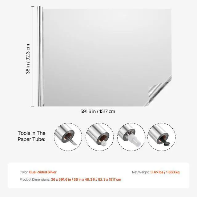 Type: Daytime Privacy Function, Nano Film,Main Materials: PET,Adhesive Method: Self-adhesive Backing,Color: Dual-Sided Silver,Product Dimensions: 36 x 591.6 in/36 in x 49.3 ft/92.3 x 1517 cm,Net Weight: 3.4 lbs/1.563 kg