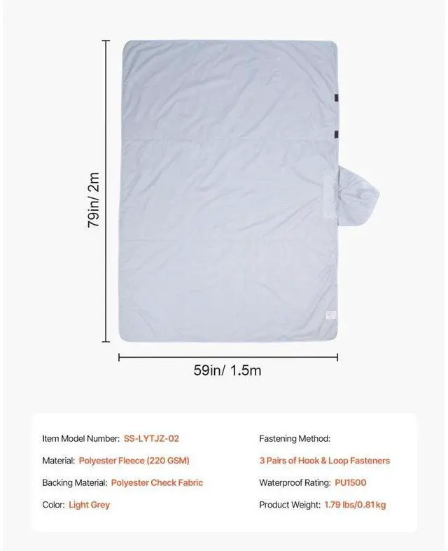 Waterproof Rating: PU1500,Color: Light Grey,Fastening Method: 3 Pairs of Hook & Loop Fasteners,Item Model Number: SS-LYTJZ-02,Product Weight: 1.79 lbs/0.81 kg,Backing Material: Polyester Check Fabric,Main Material: Polyester Fleece (220 GSM),Product Size: 79" x 59"/2 m x 1.5 m