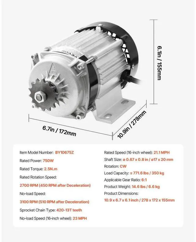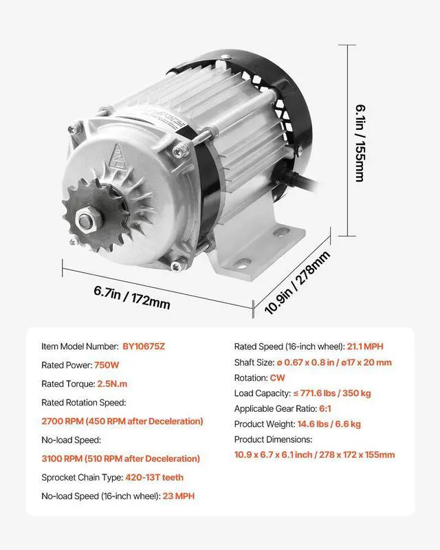 Applicable Gear Ratio: 6:1,No-load Rotation Speed: 2900 RPM (480 RPM after Deceleration),Load Capacity: 771.6 lbs / 350 kg,Noise: 70 dB,Rated Rotation Speed: 2700 RPM (450 RPM after Deceleration),Item Model Number: BY10650Z,Product Weight: 14.6 lbs / 6.6 kg,Rated Power: 750W,Product Dimensions: 10.95 x 6.77 x 6.1 in / 278 x 172 x 155 mm,Rated Torque: 2.5N·m,Rotation: CW