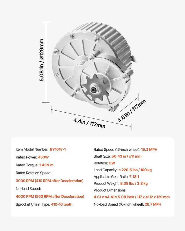Applicable Gear Ratio: 7.18:1,No-load Rotation Speed: 4000 RPM (560 RPM after Deceleration),Load Capacity: 220.5 lbs / 100 kg,Noise: 70 dB,Rated Rotation Speed: 3000 RPM (410 RPM after Deceleration),Item Model Number: BY1018-1,Product Weight: 8.38 lbs / 3.8 kg,Rated Power: 450W,Product Dimensions: 4.61 x 4.41 x 5.08 in / 117 x 112 x 129 mm,Rated Torque: 1.43N·m,Rotation: CW
