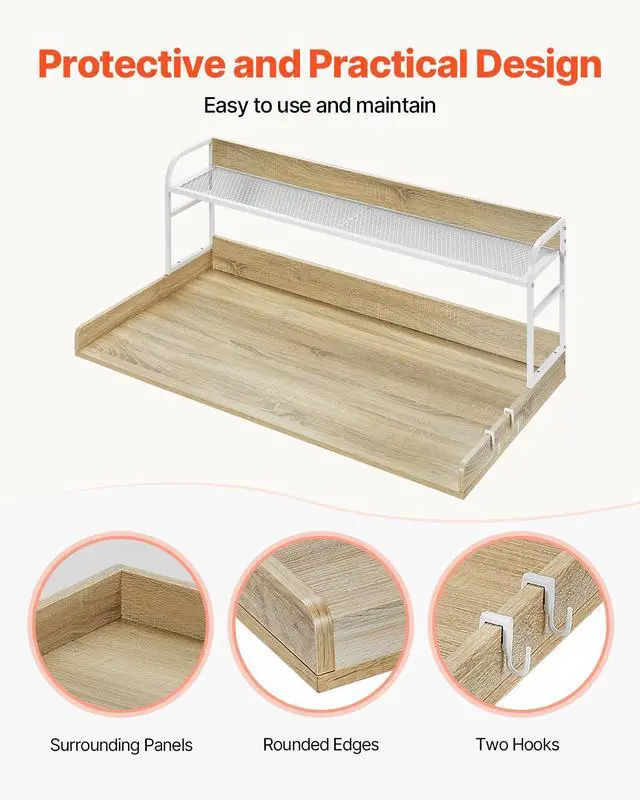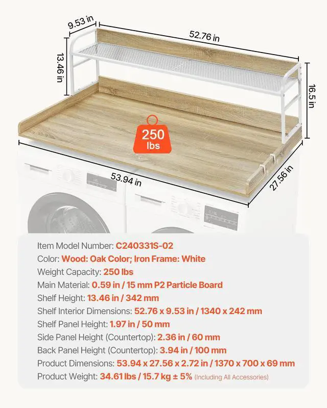 Iron Frame: White,Shelf Panel Height: 1.97 in / 50 mm,Back Panel Height (Countertop): 3.94 in / 100 mm,Weight Capacity: 250 lbs,Wood: Oak Color,Shelf Interior Dimensions: 52.76 x 9.53 in / 1340 x 242 mm,Item Model Number: C240331S-02,Product Weight: 34.61 lbs / 15.7 kg ± 5% (Including All Accessories),Material: 0.59 in / 15 mm P2 Particle Board,Shelf Height: 13.46 in / 342 mm,Side Panel Height (Countertop): 2.36 in / 60 mm,Product Dimensions: 53.94 x 27.56 x 16.50 in / 1370 x 700 x 419 mm