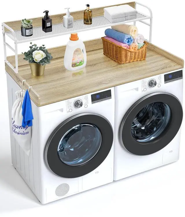 Washer Dryer Countertop with Shelf, 27" Depth x 54" Width Laundry Countertop Wood Topper with Edge Rails & Non-Slip Pads Oak