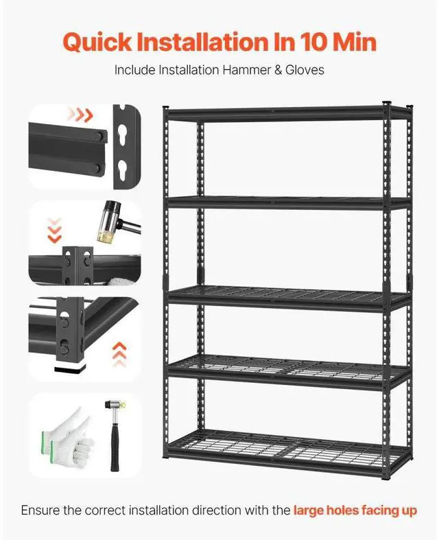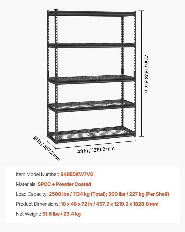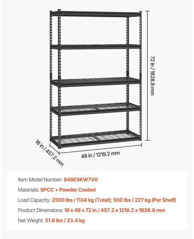 Load Capacity: 2500 lbs / 1134 kg (Total); 500 lbs / 227 kg (Per Shelf),Item Model Number: 848E5KW7V0,Material: SPCC + Powder Coated,Product Dimensions: 18 x 48 x 72 inch / 457.2 x 1219.2 x 1828.8 mm,Net Weight: 51.6 lbs / 23.4 kg (Including All Accessories)