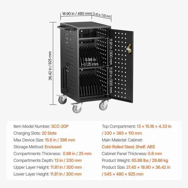 Top Compartment: 13 x 15.16 x 4.33 in / 330 x 385 x 110 mm,Compartments Thickness: 0.98 in / 25 mm,Charging Slots: 20 Slots,Cabinet Panel Thickness: 0.8 mm,Compartments Depth: 13 in / 330 mm,Storage Method: Enclosed,Product Size: 21.45 x 18.90 x 36.42 in / 545 x 480 x 925 mm,Lower Layer Height: 11.81 in / 300 mm,Item Model Number: SCC-20P,Product Weight: 65.88 lbs / 29.86 kg,Upper Layer Height: 11.81 in / 300 mm,Max Device Size: 15.6 in / 396 mm,Main Material: Cabinet: Cold-Rolled Steel; Shelf: ABS