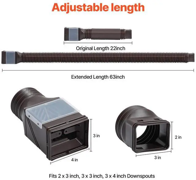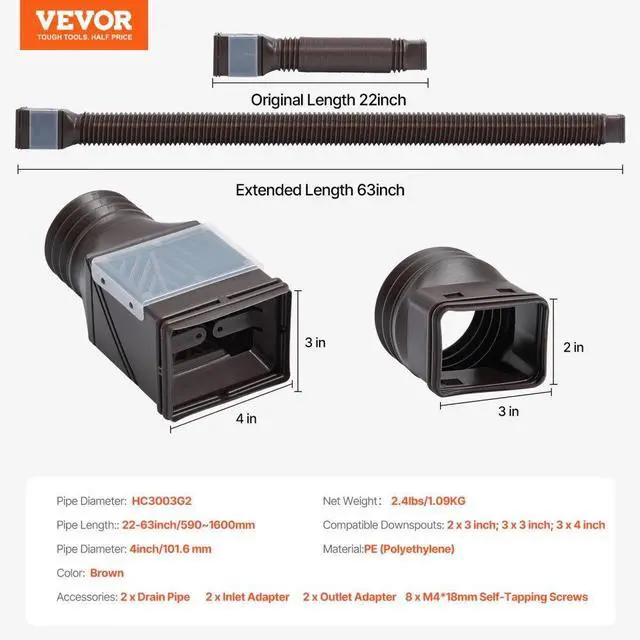 Pipe Length: 22-63 inches / 590-1600 mm,Compatible Downspouts: 2 x 3 inch; 3 x 3 inch; 3 x 4 inch,Pipe Diameter: 4 inches / 101.6 mm,Color: Brown,Item Model Number: HC3003G2,Material: PE (Polyethylene)