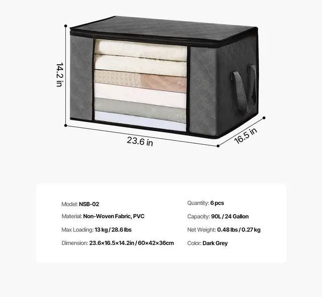 Max Load: 13 kg / 28.6 lbs,Capacity: 90L / 24 Gallon,Color: Dark Grey,Item Model Number: NSB-02,Material: Non-Woven Fabric, PVC,Dimension: 23.6x16.5x14.2in / 60x42x36cm,Net Weight: 0.48 lbs / 0.27 kg