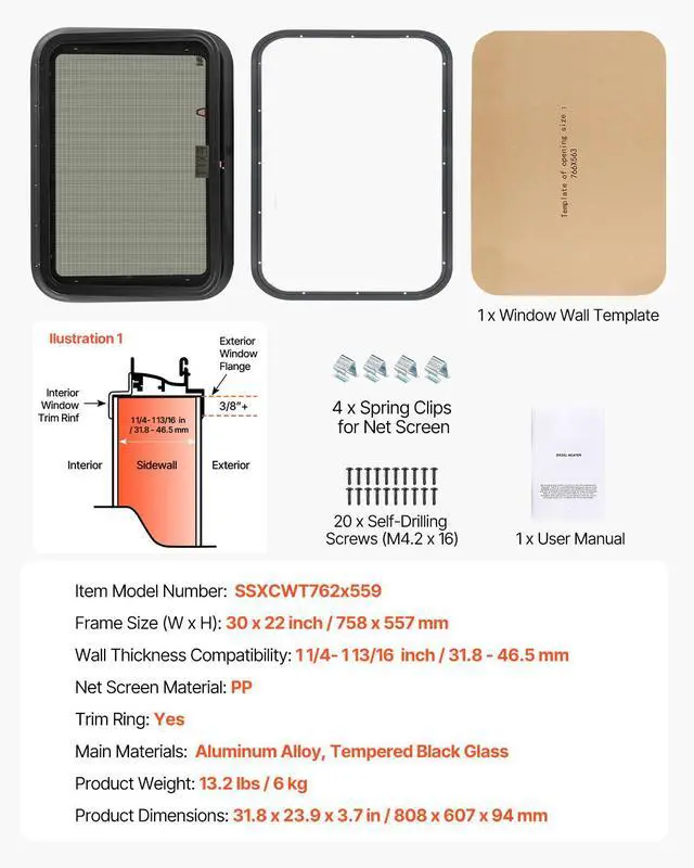 Net Screen Material: PP,Frame Size (W x H): 30 x 22 in / 758 x 557 mm,Main Materials: Aluminum Alloy, Tempered Black Glass,Item Model Number: SSXCWT762x559,Product Weight: 13.2 lbs / 6 kg,Wall Thickness Compatibility: 1 1/4 - 1 13/16 inch / 31.8 - 46.5 mm,Trim Ring: Yes,Product Dimensions: 31.8 x 23.9 x 3.7 in / 808 x 607 x 94 mm
