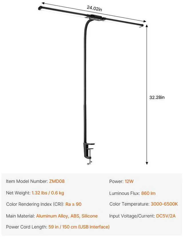 Power Cord Length: 59 in / 150 cm (USB Interface),Color Rendering Index (CRI): Ra 90,Color Temperature: 3000-6500K,Item Model Number: ZMD08,Input Voltage/Current: DC5V/2A,Net Weight: 1.32 lbs / 0.6 kg,Power: 12W,Main Material: Aluminum Alloy, ABS, Silicone,Luminous Flux: 860 lm
