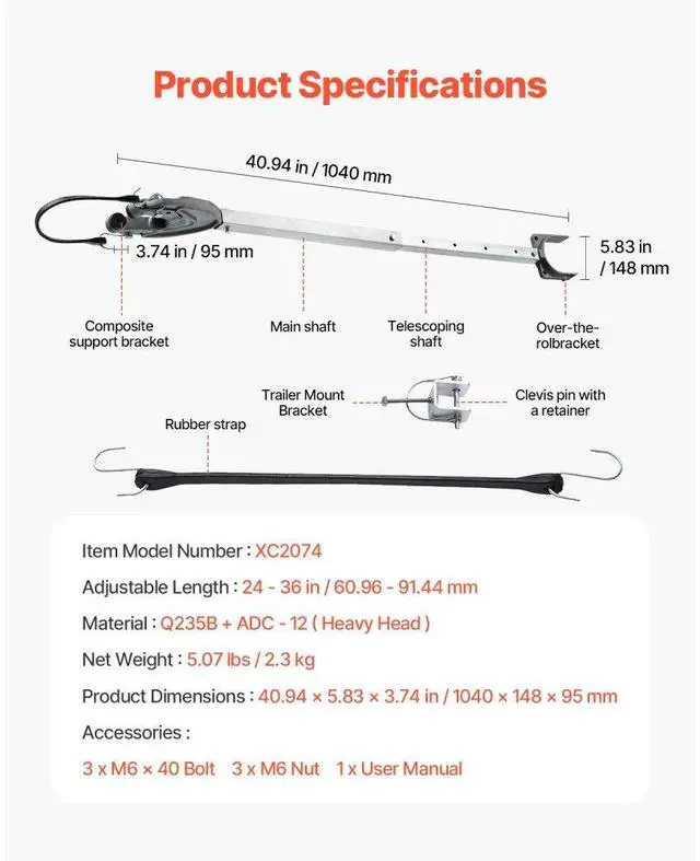 Item Model Number: XC2029,Material: Q235B+ADC-12(Heavy Head),Product Dimensions: 40.94 x 5.83 x 3.74 in/1040 x 148 x 95 mm,Net Weight: 5.07 lbs/2.3 kg,Adjustable Length: 24-36 in/60.96-91.44 mm