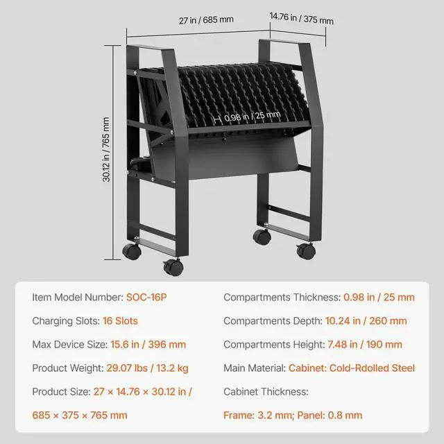 Power Cord Length: 6.56 ft / 2m,Compartments Thickness: 0.98 in / 25 mm,Item Model Number: SOC-16P,Charging Slots: 16 Slots,Compartments Height: 7.48 in / 190 mm,Product Weight: 29.07 lbs / 13.2 kg,Cabinet Thickness: Frame: 3.2 mm; Panel: 0.8 mm,Max Device Size: 15.6 in / 396 mm,Compartments Depth: 10.24 in / 260 mm,Main Material: Cabinet: Cold-Rolled Steel,Product Size: 27.00 x 14.76 x 30.12 in / 685 x 375 x 765 mm