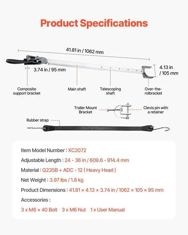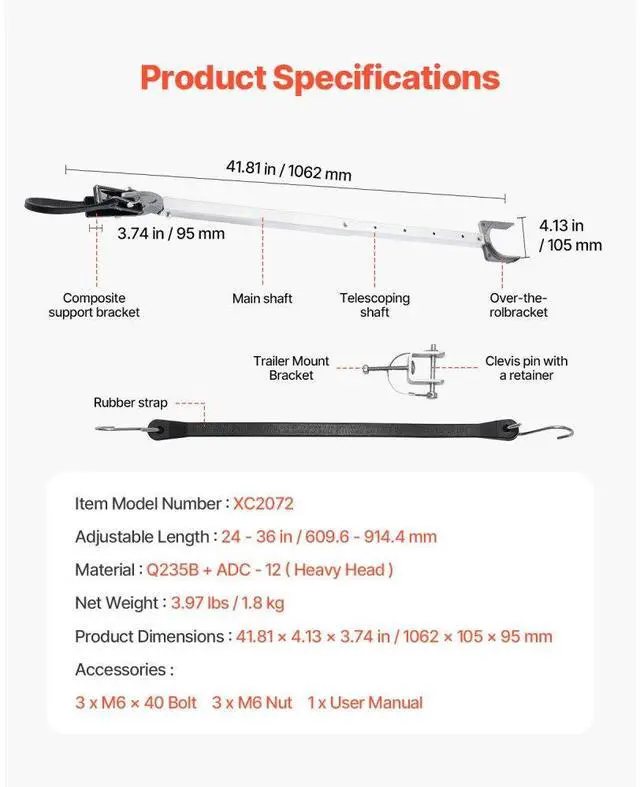 Item Model Number: XC2047,Material: Q235B+ADC-12(Heavy Head),Product Dimensions: 41.81 x 4.13 x 3.74 in/1062 x 105 x 95 mm,Net Weight: 3.97 lbs/1.8 kg,Adjustable Length: 24-36 in/609.6-914.4 mm