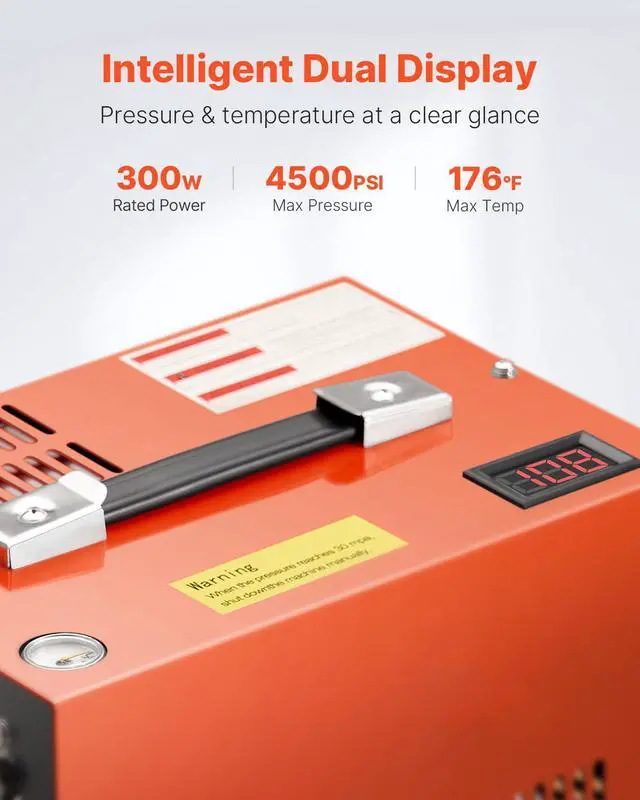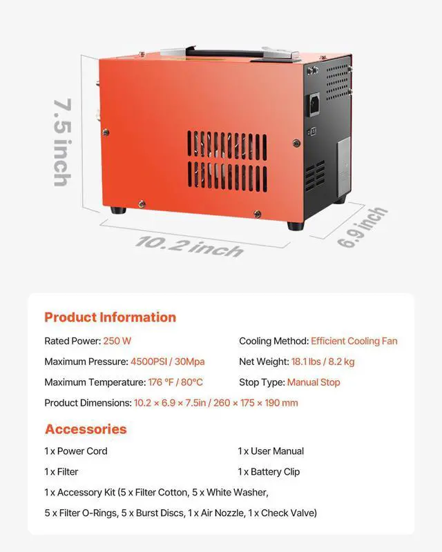 Cooling Method: Efficient Cooling Fan,Rated Power: 300 W,Maximum Temperature: 176 / 80,Product Dimensions: 10.2 x 6.9 x 7.5 in / 260 x 175 x 190 mm,Stop Type: Manual Stop,Net Weight: 15.4 lbs / 7.0 kg,Maximum Pressure: 4500PSI / 30Mpa