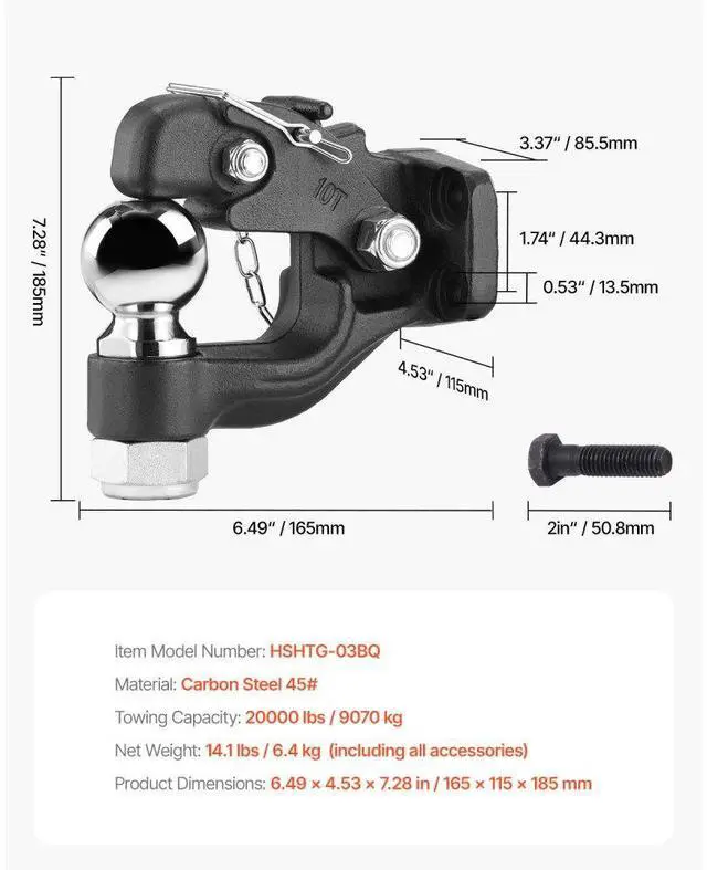 Item Model Number: HSHTG-03BQ,Towing Capacity: 20000 lbs / 9070 kg,Material: Carbon Steel 45#,Product Dimensions: 6.49 x 4.53 x 7.28 in / 165 x 115 x 185 mm,Net Weight: 14.77 lbs / 6.7 kg (including all accessories)