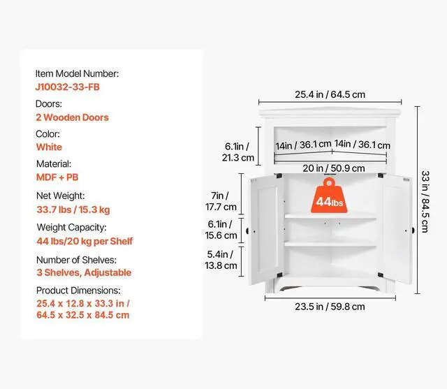 Number of Shelves: 3 Shelves, Adjustable,Weight Capacity: 44 lbs / 20 kg per Shelf,Doors: 2 Wooden Doors,Color: White,Item Model Number: J10032-33-FB,Material: MDF + PB,Product Dimensions: 25.4 x 12.8 x 33.3 in / 645 x 325 x 845 mm,Net Weight: 33.7 lbs / 15.3 kg
