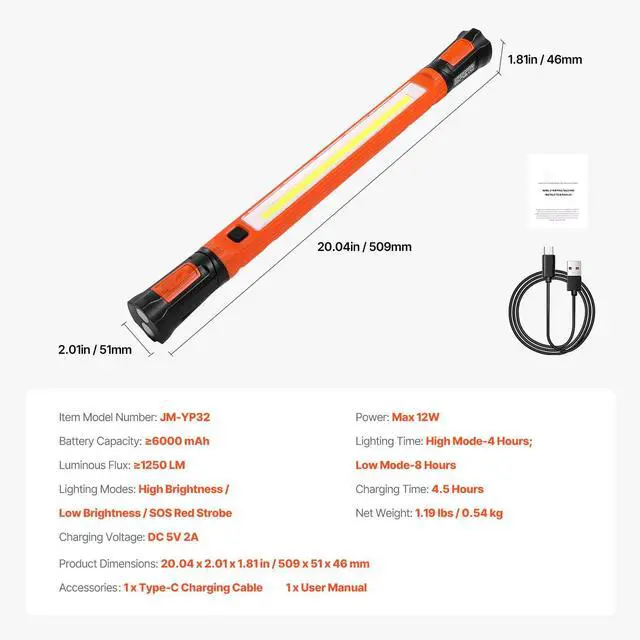 Battery Capacity: 6000 mAh,Lighting Modes: High Brightness / Low Brightness / SOS Red Strobe,Lighting Time: High Mode-4 Hours; Low Mode-8 Hours,Item Model Number: JM-YP32,Product Dimensions: 20.04 x 2.01 x 1.81 in / 509 x 51 x 46 mm,Charging Time: 4.5 Hours,Net Weight: 1.19 lbs / 0.54 kg,Power: Max 12W,Luminous Flux: 1250 LM,Charging Voltage: DC 5V 2A