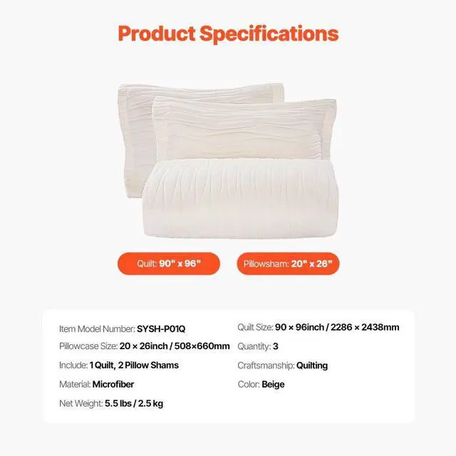 Pillowcase Size: 20 x 26 in / 508 x 660 mm,Color: Beige,Item Model Number: SYSH-P01Q,Quilt Size: 90 x 96 in / 2286 x 2438 mm,Craftsmanship: Quilting,Quantity: 3,Include: 1 Quilt, 2 Pillow Shams,Material: Microfiber,Net Weight: 5.5 lbs / 2.5 kg