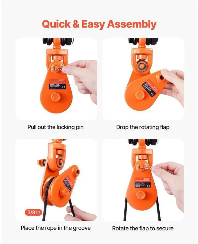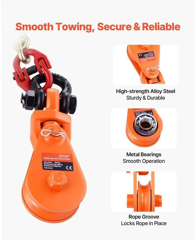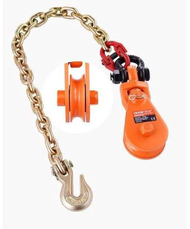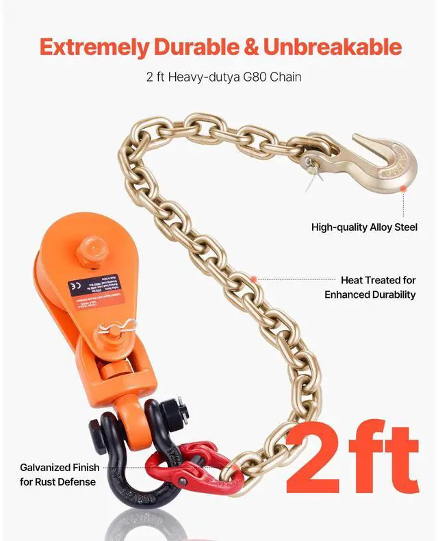 Compatible Rope Size: 3/8 in,Breaking Strength: 10000 lbs / 4.5 T,9.3 x 2.9 x 1.5 in / 235 x 74 x 37 mm:,Lift Ring Dimensions: 1.8 / 0.5 / 4.8 / 2.6 in,Chain Length: 2 ft / 0.6 m,Pulley Diameter: 3 in / 74 mm,Pulley Dimensions:,Hook Opening Size: 5/16 in,Chain Length with Hook: 2.23 ft / 0.68 m,Item Model Number: 2TX0.6m,Product Weight: 7.7 lbs / 3.5 kg,Chain Grade: G80,Working Load: 4400 lbs / 2 T