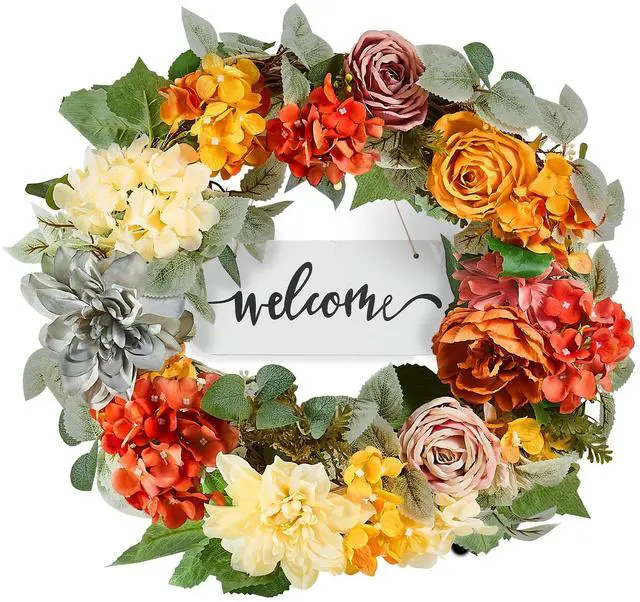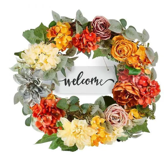 Outer Diameter: 24 in/60.96 cm,Main Materials: Silk Fabric, PE,Flower Diameter (Excluding Leaves): 20 in/50.8 cm,Ring Width: 7.87 in/200 mm,Color: Red, Orange, Yellow,Item Model Number: WA53359,Flowers: Hydrangeas, Roses, Wooden Sign,Net Weight: 1.54 lb/0.7 kg
