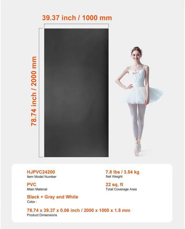 Total Coverage Area: 22 sq. ft,Color: Black + Gray and White,Item Model Number: HJPVC24200,Maximum Load per Panel: 440 lbs / 200 kg,Quantity: 1 pc,Product Dimensions: 78.74 x 39.37 x 0.06 inch / 2000 x 1000 x 1.5 mm,Net Weight: 7.8 lbs / 3.54 kg,Main Material: PVC