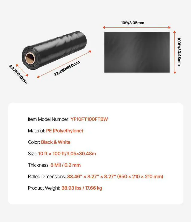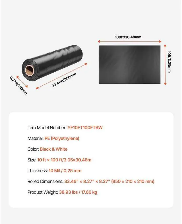 Thickness: 10 Mil / 0.25 mm,Size: 10 × 100 ft (3.05 m × 30.48 m),Color: Black & White,Item Model Number: YF10FT100FTBW,Product Weight: 38.93 lbs / 17.66 kg,Material: PE (Polyethylene),Rolled Dimensions: 33.46" × 8.27" × 8.27" / 850 × 210 × 210 mm