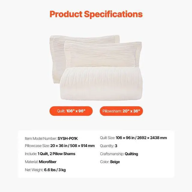 Pillowcase Size: 20 x 36 in / 508 x 914 mm,Color: Beige,Item Model Number: SYSH-P01K,Quilt Size: 106 x 96 in / 2692 x 2438 mm,Craftsmanship: Quilting,Quantity: 3,Include: 1 Quilt, 2 Pillow Shams,Material: Microfiber,Net Weight: 6.6 lbs / 3 kg