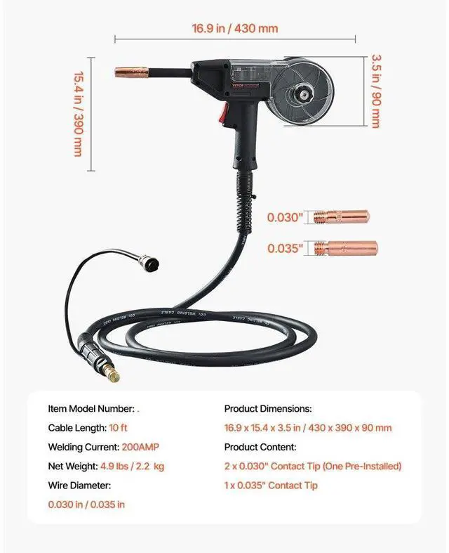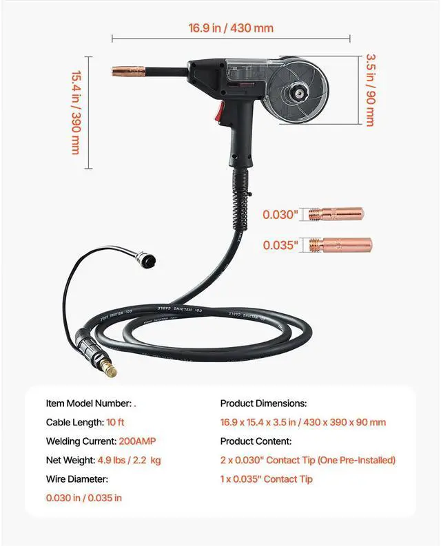 200Amp Spool Gun with 10FT Cable Suitable for 0.030" and 0.035" Welding Wires