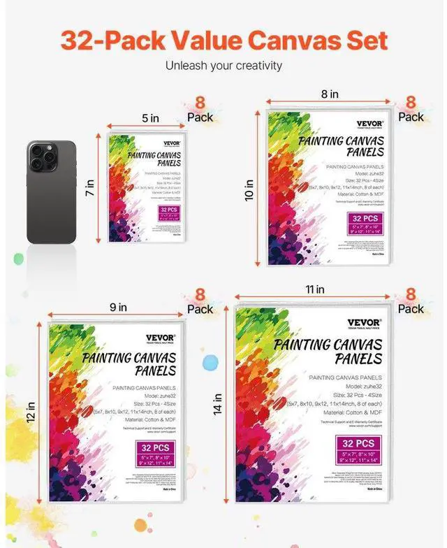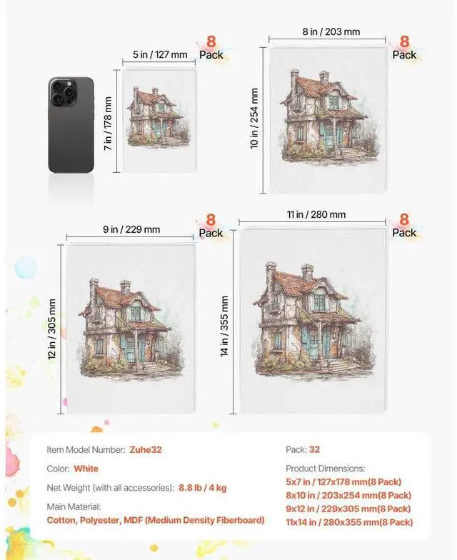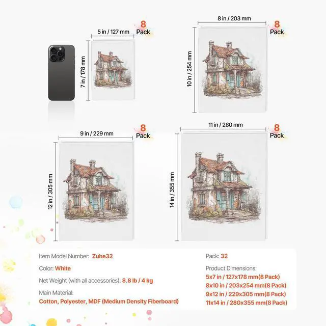 Color: White,Item Model Number: Zuhe32,Product Dimensions: 5x7 in / 127x178 mm(8 Pack), 8x10 in / 203x254 mm(8 Pack), 9x12 in / 229x305 mm(8 Pack), 11x14 in / 280x355 mm(8 Pack),Pack: 32,Net Weight (with all accessories): 8.8 lb / 4 kg,Main Material: Cotton, Polyester, MDF (Medium Density Fiberboard)