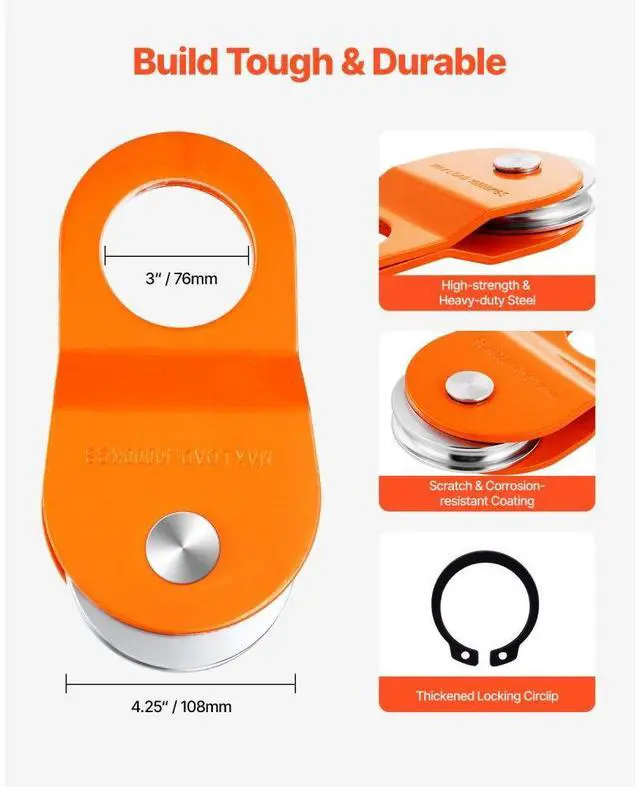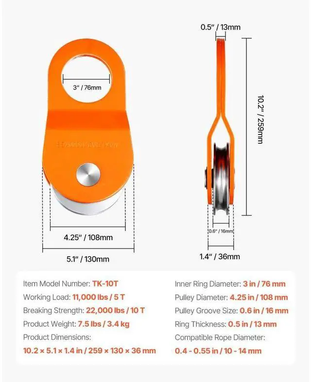 Outer Ring Diameter: 4.6 in / 117 mm,Inner Ring Diameter: 3 in / 76 mm,Breaking Strength: 22,000 lbs / 10 T,Ring Thickness: 0.5 in / 13 mm,Item Model Number: TK-10T,Product Weight: 7.5 lbs / 3.4 kg,Pulley Groove Size: 0.6 in / 16 mm,Compatible Rope Diameter: 0.4 - 0.55 in / 10 - 14 mm,Product Dimensions: 10.2 x 5.1 x 1.4 in / 259 x 130 x 36 mm,Pulley Diameter: 4.25 in / 108 mm,Working Load: 11,000 lbs / 5 T